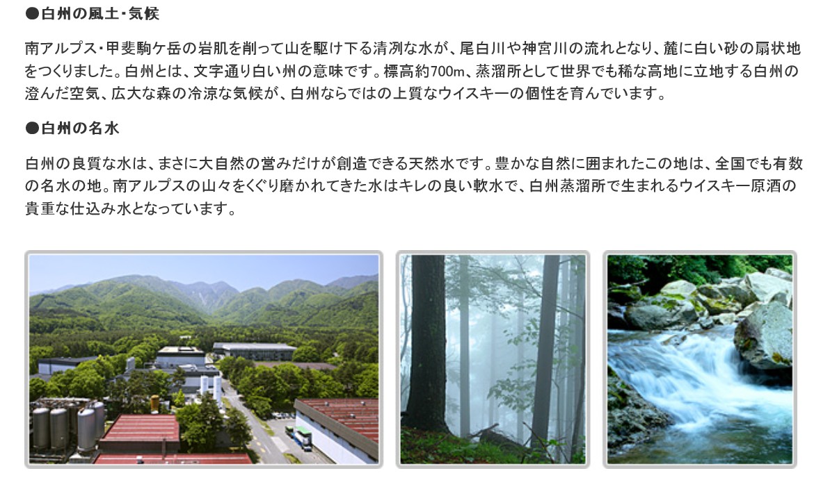 この自然豊かな白州で創られるウイスキーの蒸留所と天然水の工場を見学します。