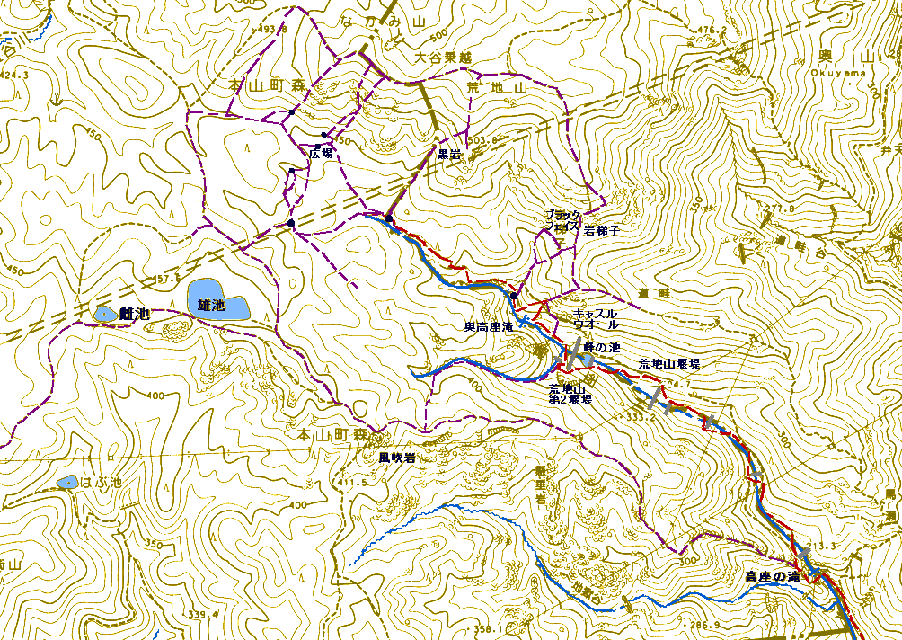 コース 登り:芦屋川〜高座滝〜奥高座滝〜横池(昼食) 高座谷の地図