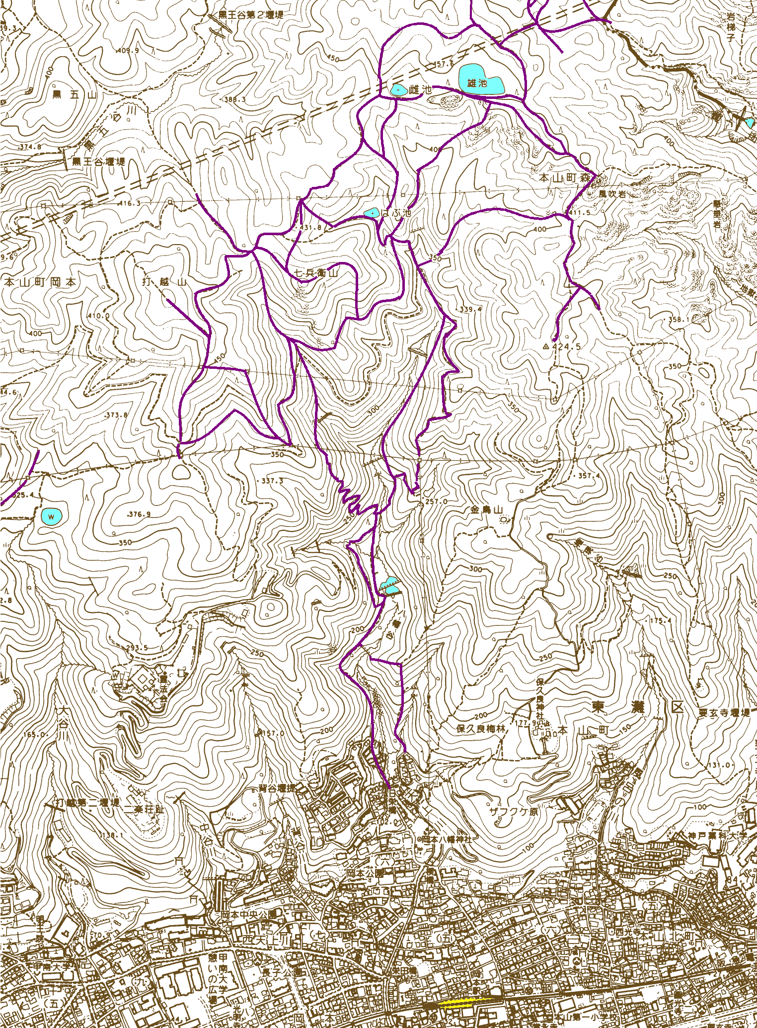 下り:横池〜打越峠〜八幡谷〜岡本 下山コースの地図