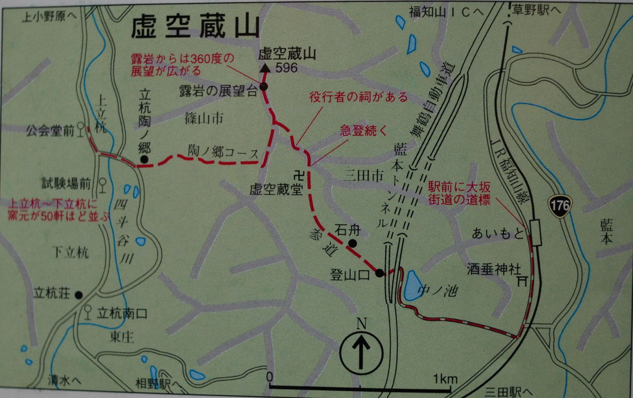 1/15 作成 1/16 参加者、アイゼン記事等追加 1/18 参加者追加 1/19 連絡事項、参加者、写真追加 h23近畿支部 新春・虚空蔵山Pw計画 これ以前の連絡・案内 これ以降の連絡・案内 1月計画をようやく決定しましたのでご連絡致します。 新年初回厳寒期ということで、道路凍結を気にせず駅から即歩ける、なまった体に鞭打つ長いコースは避ける、それなりに下山後の楽しみが少しはあるという基準で、JR福知山線三田奥の虚空蔵山から立杭焼き陶の郷に至るコースとしました。 日 取 h23 1月22日(土) 雨天中止 (天気予報 丹波 宝塚) 場 所 虚空蔵山:596m 案内図 このあたりの立体地形図 コース 藍本駅から徒歩出発〜(80分)〜虚空蔵堂〜(40分)〜虚空蔵山山頂 (露岩展望台あたりで昼食 40分)〜(20分) 〜立杭陶の郷 一旦ここで流れ解散(13時〜14時頃か) 集 合 1月22日(土)9:40 JR藍本駅西改札出口(東改札口ではありません) ご参考までに代表的なJR時刻表は下記の通りです。 JR大阪発8:36快速姫路行 尼崎着8:42 尼崎発(3番ホーム) 8:43快速篠山行 (宝塚発 9:02) 藍本着 9:30 大阪8:36は尼崎での乗り換えに1分しかなく無理かも。 その場合 大阪発8:30新快速姫路行 大阪/藍本 \950 (参考:JR時刻表 尼崎から篠山方面 神戸線下り 神戸線上り ↓ ) 尼崎駅出発ホームについては、時刻表の各列車をクリックしてください 解散場所 丹波立杭焼:陶の郷 1)希望者は陶の郷を冷やかす(入郷料¥200) 立杭焼き全作家の作品が並んでおり、観光客向け価格?で販売しているようです。 2)早め帰宅の用事のある方は神姫バス15分でJR福知山線相野駅へ 3)立杭冷やかし組も同経路で相野駅へ 帰りのバス時刻 陶の郷前 9:56 15:18 16:29 18:00 (1日この4本のみ) 相野駅 10:11 15:31 16:39 18:13 参加者 17名(1/21現在) 現在参加受付中 装 備 (通常の個人装備以外) (1)ある程度の防寒対策衣類 (2)お湯(団体装備:約500ml/人) 2月最厳寒期には20cm積雪の年もあるようです。今週の雲行きによっては若干の積雪がある可能性が大です。積雪は僅かであろうと高を括ってますが、念の為、軽アイゼン持参をお奨めします。(ストックも) 会 費 なし (ただし、解散後に必要な料金は次のとおりです) バス代290円(陶の郷〜JR相野駅)、陶の郷入園料:200円 温 泉 特に考えていません。 入りたいときは、宝の湯(JR中山)、ナチュールスパ(宝塚)があります。 その他 詳細がわかれば、順次掲載します。 企 画 藤井直樹(10期) 申し込み ←なるべくならこのメールをお使いください。 または 藤井直樹 (072)782-2521 090-4647-9972(携帯) 加藤忠好 (078)935-8658 090-6201-8039 (携帯) 参加〆切:1/21(金) 返信内容(以下の内容について記載願います) KUWV 期 氏名 1月22日の山行きに 参加 ( )する。 ( )できない。 コメント 企画者からの連絡 本日現在の参加予定をご連絡します。(参加者参照) 寒気が緩んで来てますので、積雪は僅かであろうと高を括ってますが、念の為、軽アイゼン持参をお奨めします。(1/18記) 現時点の申し込み状況をご連絡します。(参加者参照) 結局偵察なしのぶっつけ本番となりましたので、登山道状況が不明ですが、ガイドブックによれば楽なコースのようです。 ただ、今朝から伊丹でも少し雪が舞ってますので、今週の雲行きに よっては若干の積雪がある可能性が大です。簡易アイゼンをお持ちの方は荷物に余力があれば持参頂いたほうが良いと思われます。(1/16記) 実は私事ながらギックリ腰で寝た切り正月を5日まで楽しんでしまい、全く偵察しておりません。資料によれば道迷いの心配はなさそうですので、ぶっつけ本番で考えております。 閉門蟄居中に枕元の木刀で立ち上がって、パソコンに向かって虚空蔵山で考えてますと呟いた途端、年末から同行偵察の助っ人を申し出て頂いていた金岩さん、伊豫さん、篠島さん、中でも忠好さんが直ちに反応してくれて、あっと言う間にHPに計画案が掲載されたのは実に有り難いことでありました。これなら20年後、本格寝た切りでも布団の上で幹事は務まるなと意を強くしました。 途中経過で大岩岳を挙げてましたが、金岩さん提供の神戸市情報に大岩岳は2月15日まで狩猟解禁、ハンターにハイカーを撃つな、ハイカーに撃たれないよう派手な服を着るようにとのアドバイスが載っており仰天しました。あの辺であれば猪猟と思われ、参加予定者の中に自分は正面からハンターに遭遇すると撃たれる恐れがあるとの声もありましたので外しました。期待していた方には申し訳ありませんがご了承願い度く。(1/9記) -以上-