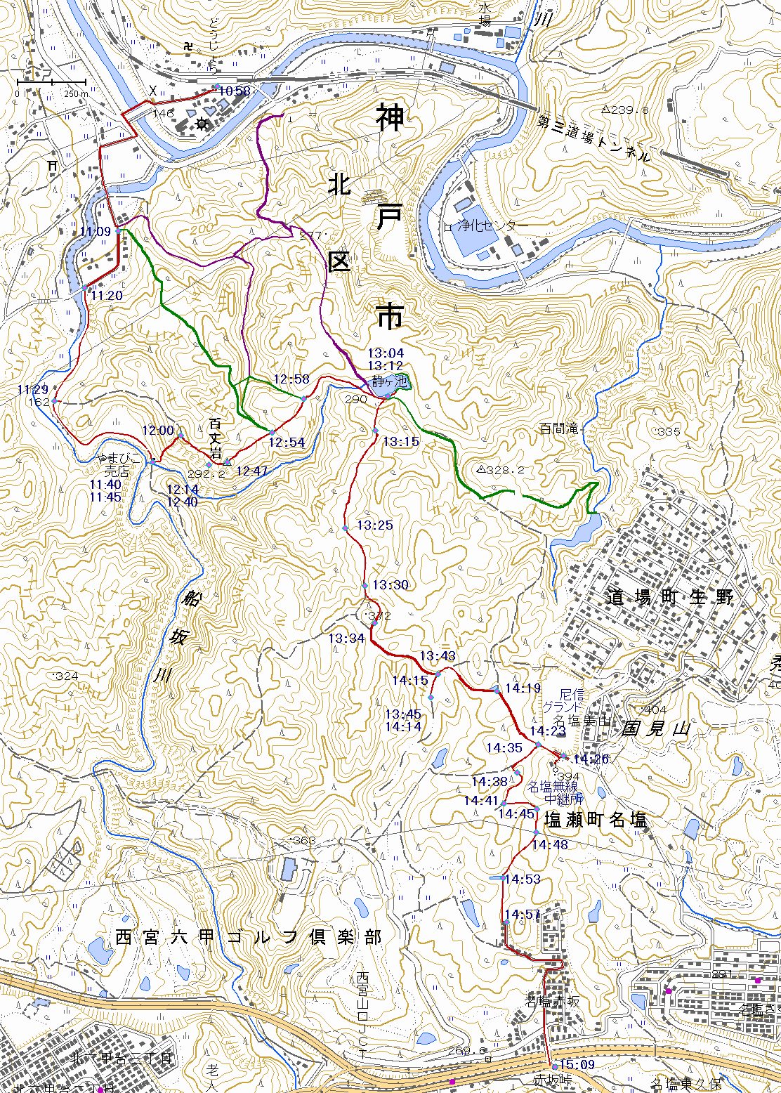 6/5 作成 これ以前の連絡・案内 これ以降の連絡・案内 6/6 下山コース変更 参加者追加 6/7 実施日変更 蒸し暑くなりがちな6月ですが、鎌倉峡の谷から吹き上げる風がさわやかな百丈岩と小鳥のさえずりと静けさの別天地である静ノ池巡りを計画致しました。神戸市北区に聳える標高はわずか292.2mの岩稜百丈岩と岩から尾根つたいに続く静ノ池をJR道場駅からゆっくり一周するコースです、涼風の百丈岩での高度感あふれる大展望と静ノ池でのお食事タイムをお楽しみください。 百丈岩はクライマー達が集まる岩場コースでもあります、我々はクライミング風景を眺めながらの登山を楽しみます。 下山は、静ヶ池から平坦な稜線を南下し、赤坂峠まで歩きます。途中の稜線が土塁状になっている不思議な地形があります。また、このあたりは河川の争奪地形が多く見られる地域、小川さんの説明があればうきうきとしてくる地域です。 h23近畿支部 6月 涼風の百丈岩・静ノ池Pw 計画 日 時 h23 6月11日(土) 12日(日)に変更 宝塚付近の天気予報 場 所 百丈岩および静の池 (国土地理院の地形図) コース JR道場駅〜売店「やまびこ」登山口〜百丈岩〜三角点〜静ノ池〜砂場〜赤坂峠 赤坂峠からJR西宮名塩まで阪急バスを利用 歩行予定時間約180分(休憩・昼食は除く) その他の見もの: ・三角点付近の貴重種の「いしもちそう」、静ノ池の「もうせんごけ」等 集 合 6月11日(土) 10時10分 JR道場駅(神戸市北区・JR宝塚線) JR道場駅は普通電車しか止まりませんので、ご注意を!! アプローチ 大阪-JR尼崎発−JR宝塚−西宮名塩−JR道場 9:14 9:22 9:55 10:00 10:08 (普通:新三田行) 9:21 9:27 9:46 9:50 − (丹波路快速:篠山口行) − 9:32 9:52 (快速:宝塚行) (大阪・阪神方面の方は阪急で宝塚へ、宝塚でJR線乗り換えが安くなります) 解 散 JR西宮名塩(JR宝塚線:快速停車駅) 15時〜15時半頃 装 備 初夏の低山行きの服装・装備、靴は登山靴、昼食・行動食、傘、団扇 団体装備として白湯を 500ml/人 程度ご持参ください。 費 用 (阪急バス 240円:赤坂峠=JR西宮名塩) 風 呂 希望者は「宝乃湯」が便利です。 参 加 6/6現在 8名 なお当日、飛び入りでも構いません。 企 画 篠島益夫 その他 5/31に静ヶ池〜赤坂峠の下見の結果、下山コースをこのように変更しました。 先日の下見の記録←クリックしてください 申し込み できれば、参加申し込み早めにお願いいたします。(企画者宛) 予定が立たない方は、当日の飛び入り参加でも結構です。 [参加申し込み自動作成メールにて、受付中] 次の空欄に必要事項を書き入れ(選択)、「企画者にメールする」ボタンを押せば、ここで記載した内容が 自動的に編集され、あなたのメールがメーラー(メールソフト)を経由し、企画者・事務局に自動送信されます。 (ただし、返信は自動的でないので、遅れる場合があります。) 氏名を入れてください 氏名 6月の近畿支部「百丈岩Pw」に ・参加するつもりです ・先約があり参加できません ・下のコメント欄に記します ←該当する項目をマウスでクリックし反転文字にしてください。 コメント(省略可) <ここにコメントを書いてください> ・上記の内容を企画者に送信するときは、ボタンを押したあと、 パソコンから2回ほど注意メッセージがでますが、そのまま送信してください。 ここで送信したメールについては、あなたのメーラー(メールソフト)の送信アイテムで見ることができますので、 必ず送信アイテムを見て送信内容を確認してください。 ・入力した文字を全て消したいときは、 ボタンを押してください。 ↑ 上に説明した自動送信メールに不審を抱いている方は、従来どおりのこちらのメールをお使いください。 または、従来どおりの自分の方法でメールしてください。