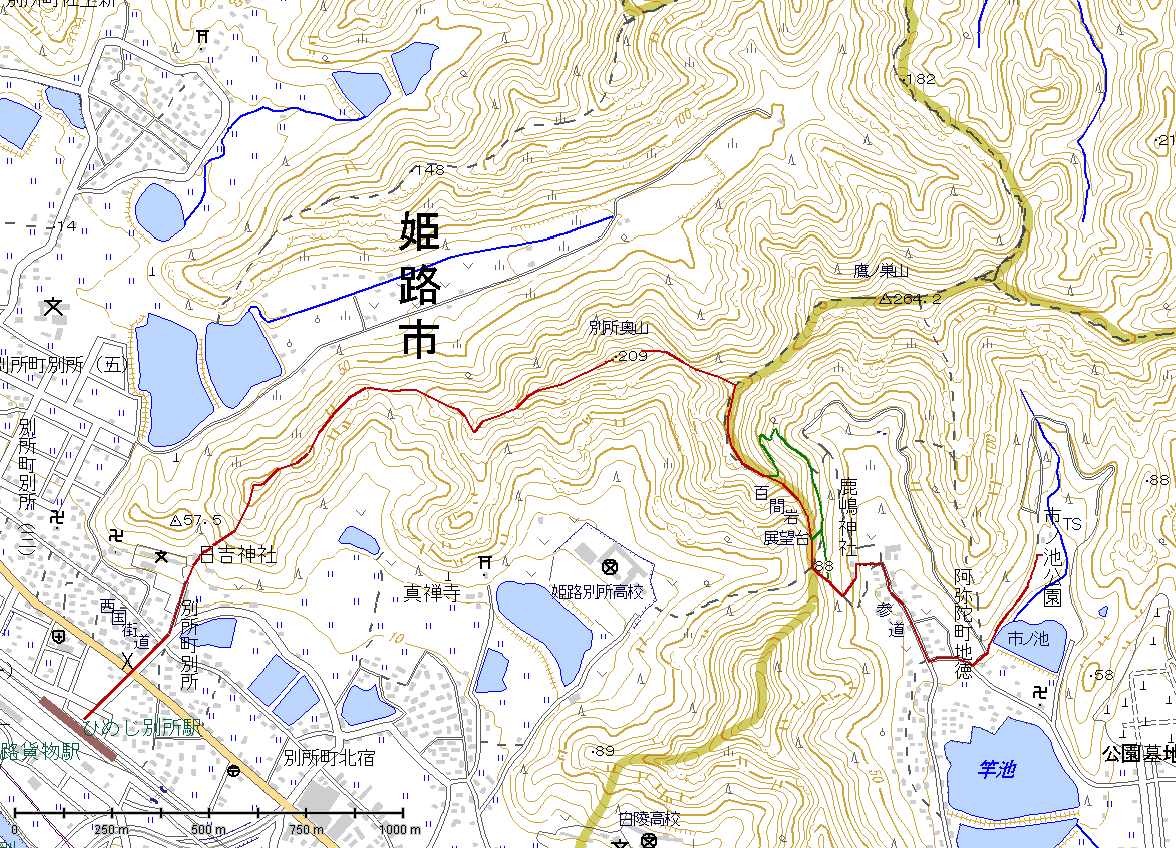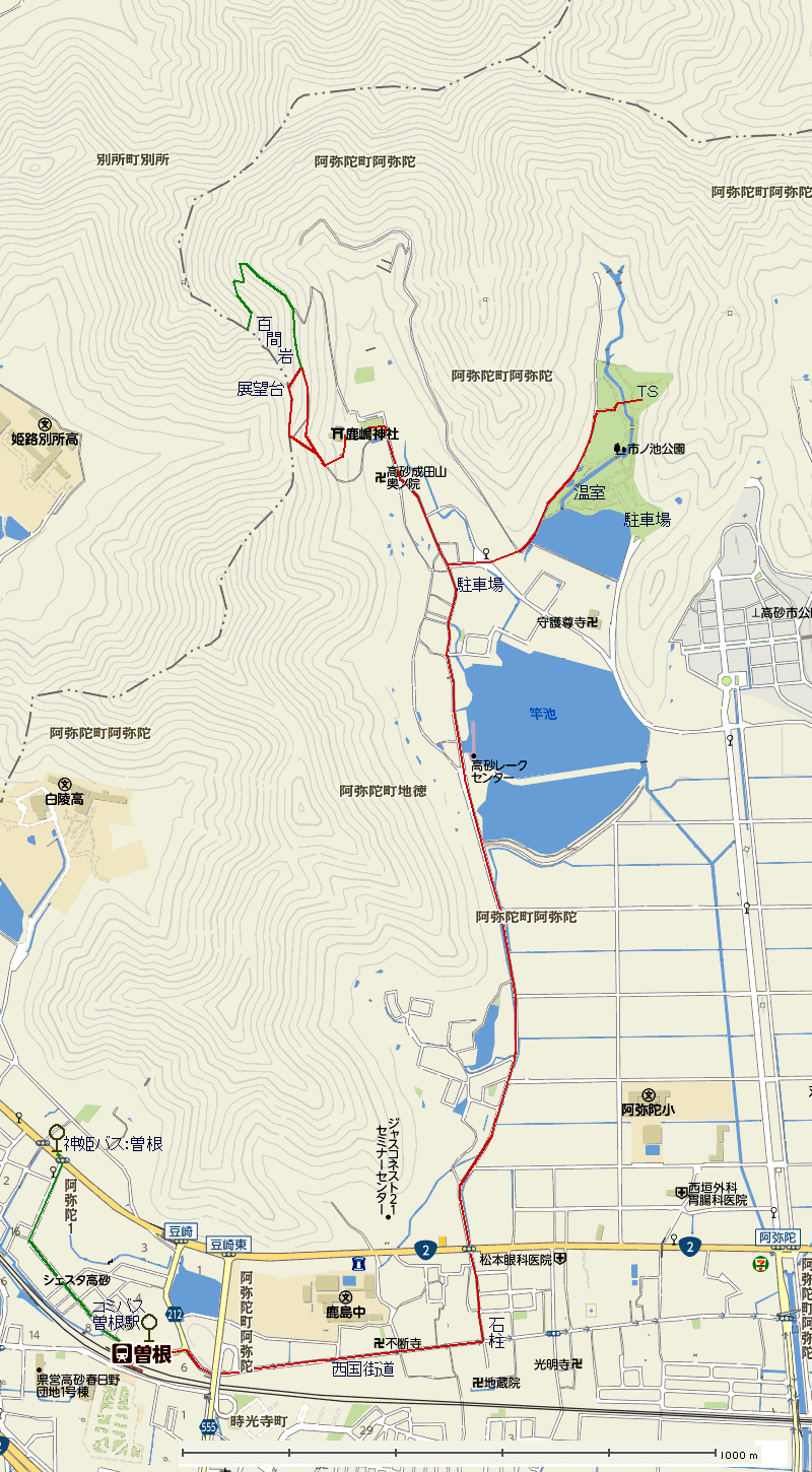 コース JRひめじ別所駅〜日吉神社〜(稜線)〜別所奥山〜百間岩〜鹿嶋神社〜