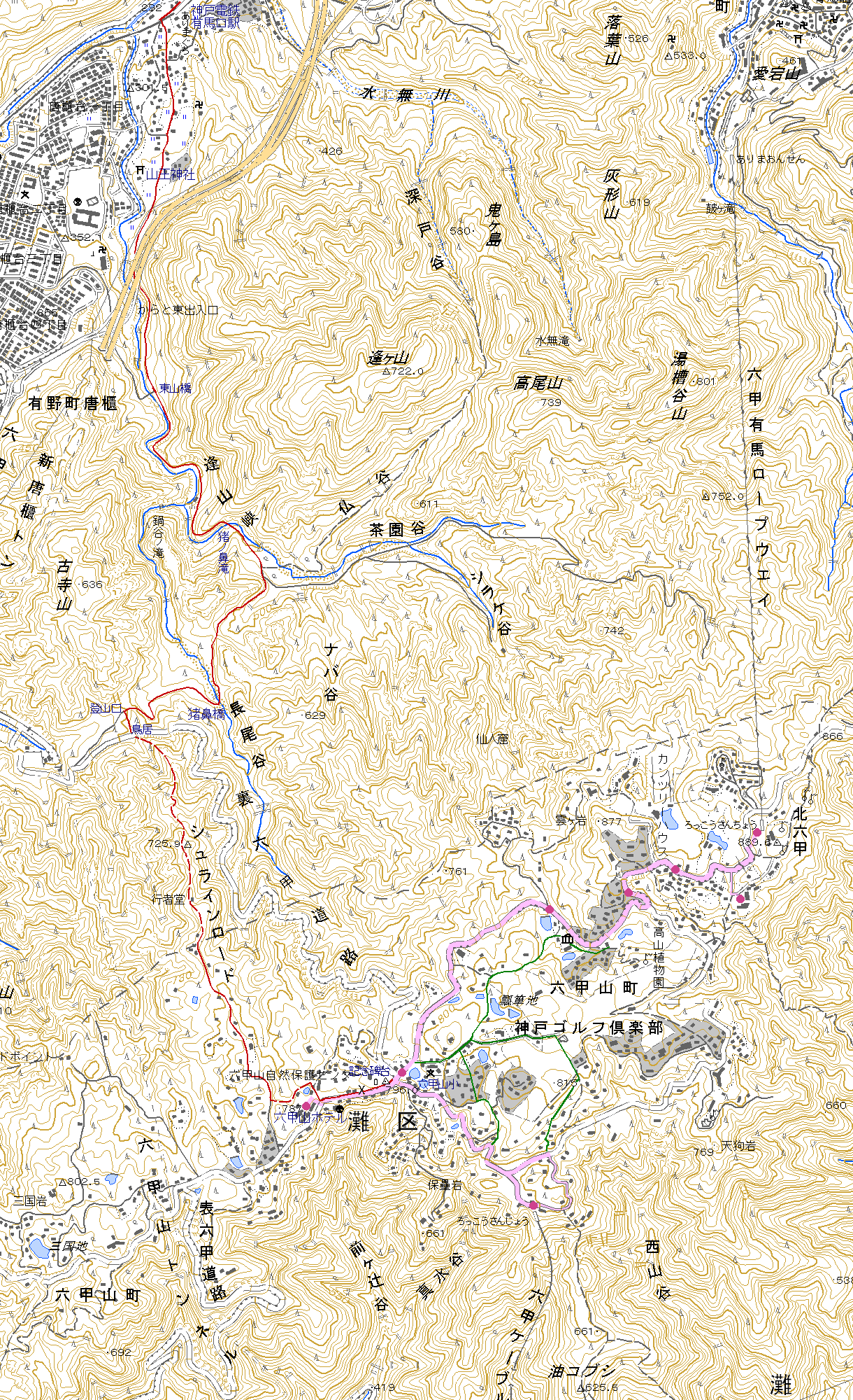 2.目的地 六甲記念碑台(796m):ルート図、地形図(有馬口駅)、(記念碑台)