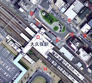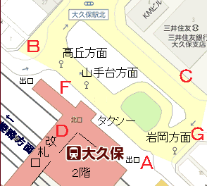 大久保駅北口のA地点でお待ちください。車は一旦C地点に参ります。