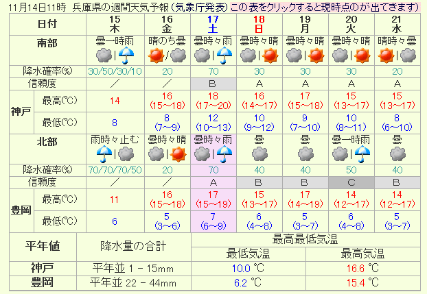 @ 前日11/16(金)午後7時(19:00)の気象庁発表の天気予報で