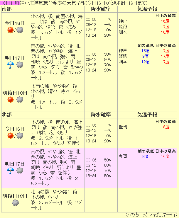 @ 前日11/16(金)午後7時(19:00)の気象庁発表の天気予報で