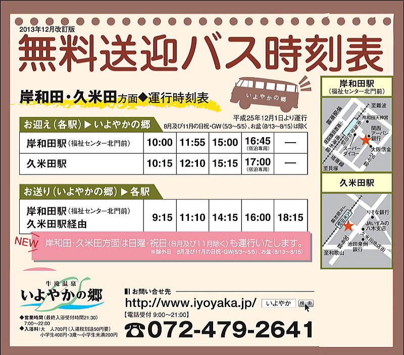 <いよやかの郷無料送迎バス:南海・岸和田駅前、JR久米田駅から現地まで>