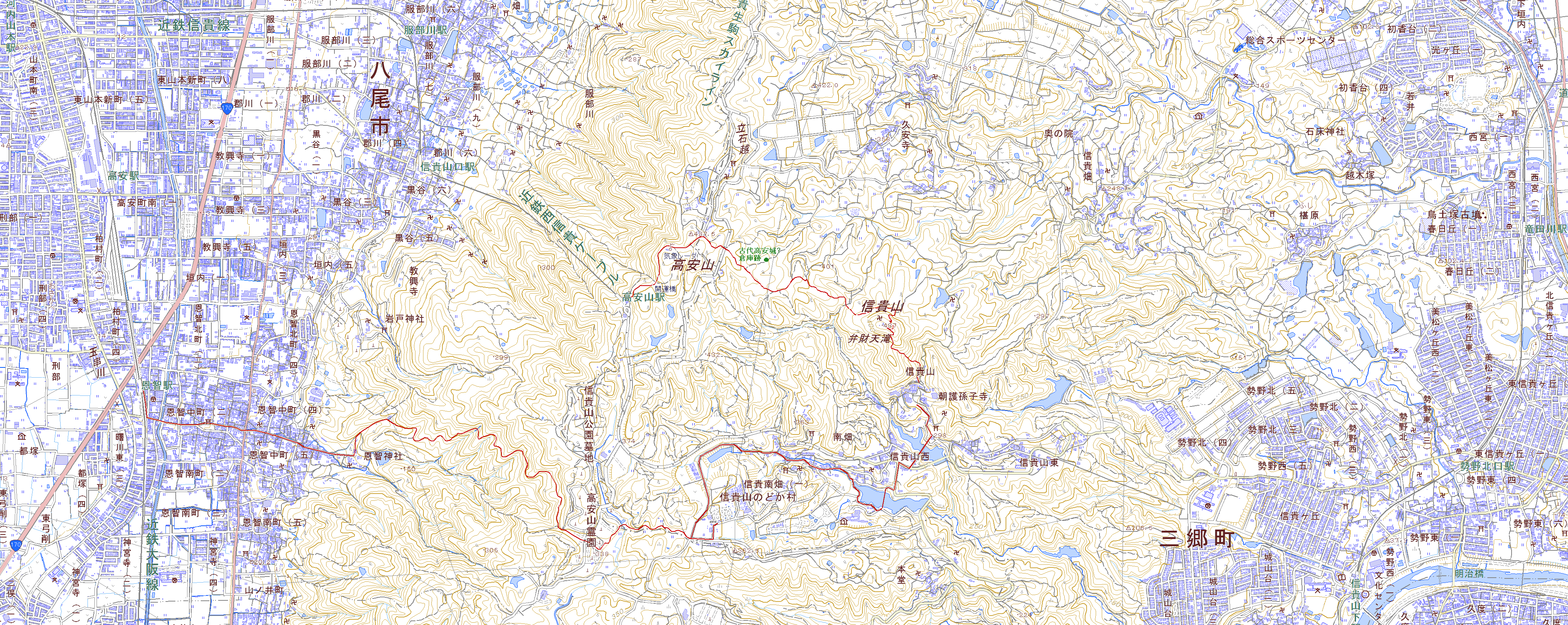 目的地 信貴山、高安山 地形図(予定ルートを加えました)