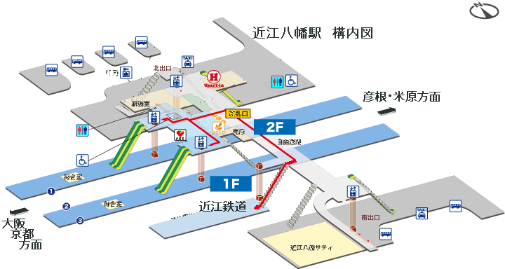JR近江八幡駅改札(2F)を出て右に(南側に)走ると1Fへの階段があり、
