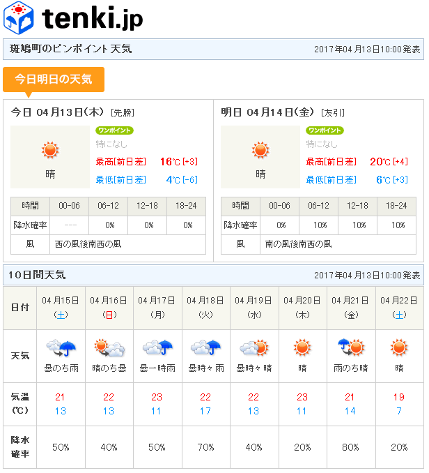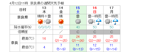 4/13朝のBS予報では斑鳩は午後雨となってますので、改めてご連絡します。