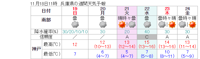 当初晴れ予報だったのに、11/22(水)の天気予報は下り気味。よって、参加予定者全員のの承諾を得て、実施日を前日の11/21(火)に変更しました。その他については、変更ありません。
