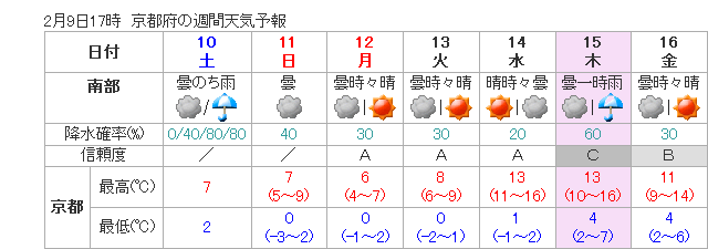 最近は天気予報の的中率も向上してきているので、早ければ、2/13(火)中に実施の可否について判断しようと思います。判断基準としては、寒い折なので、気象庁の天気予報で、京都府南部の実施時刻帯で、降水確率が50%以上のときは中止にしようと思っています。中止の場合は、参加申し込みされた方には、メールで連絡致しますが、近畿支部のHPチェックもよろしくお願いいたします。 |