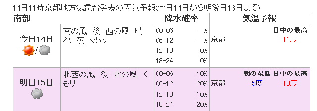 1)気象庁、京都府南部の天気予報で、明日(2/15)の実施時間帯(6~18時)での降雨確率が50%以上となった場合は中止します。