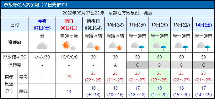 天気予報による判断基準 5/11(水)11時の気象庁発表の京都府南部の天気予報で、