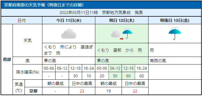 天気予報による判断基準 5/11(水)11時の気象庁発表の京都府南部の天気予報で、